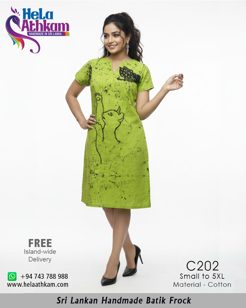 ලා කොල පැහැයත් කලු පැහැයත් භාවිතා කර සමනලුන් පසුපස යන පූස් පැටියෙකුගේ රුවක් ඇසුරෙන් ශ්රී ලාංකීය සාම්ප්රදායික බතික් ක්රමශිල්ප භාවිතයෙන් “හෙළ අත්කම්“ විසින්ම 100% අතින් නිපැයූ උසස් තත්වයේ නියම දේශීය බතික් ගවුමක්.