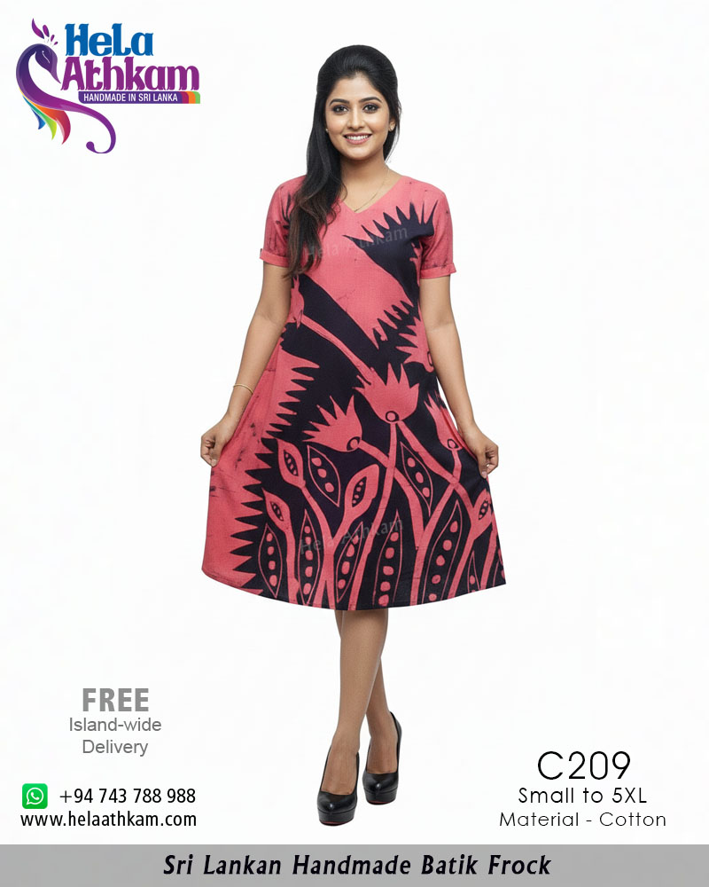 පීච් පැහැති පසුබිමක කලු පැහැයෙන් නෙලුම් විලක දර්ශනයක් ඉස්මතුවන සේ ශ්රී ලාංකීය සාම්ප්රදායික බතික් ක්රමශිල්ප භාවිතයෙන් “හෙළ අත්කම්“ විසින්ම 100% අතින් නිපැයූ උසස් තත්වයේ නියම දේශීය බතික් ගවුමක්.