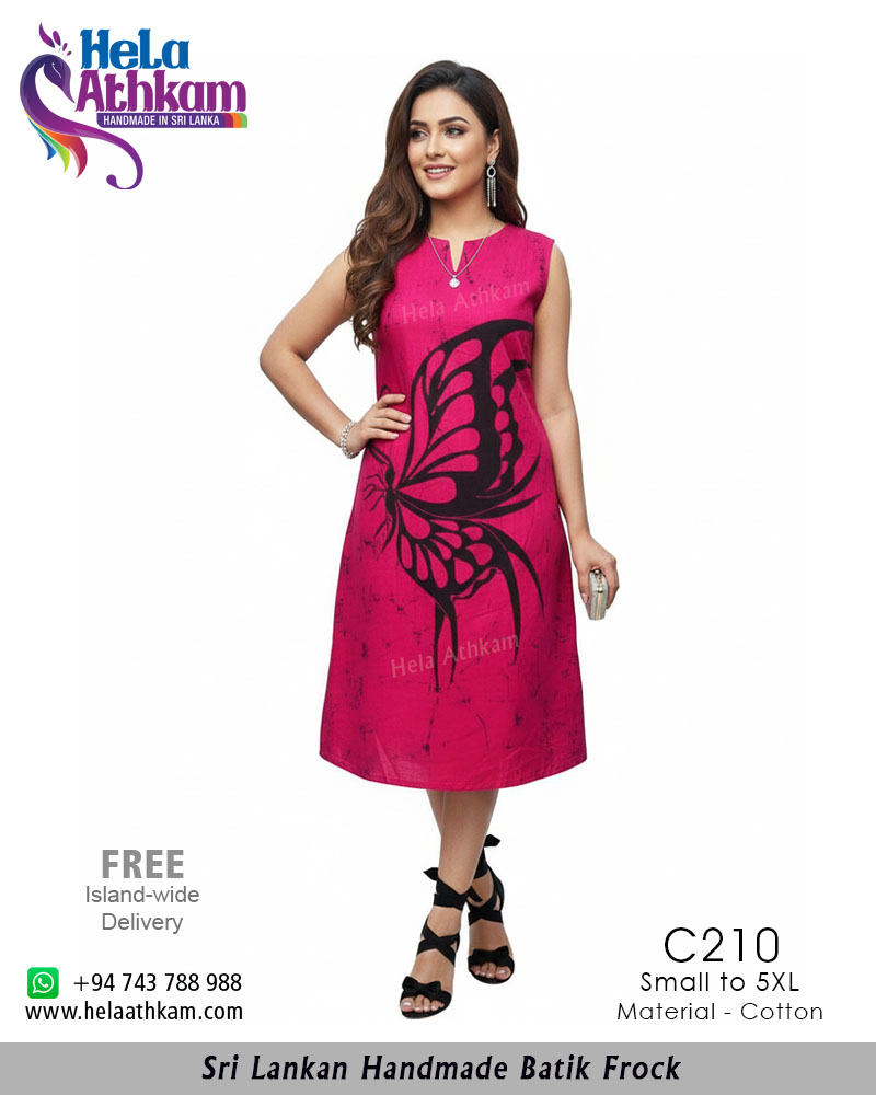 මැජෙන්ටා පැහැති පසුබිමක කලු පැහැයෙන් විචිත්‍ර සමනලයෙකුගේ රුවක් ශ්‍රී ලාංකීය සාම්ප්‍රදායික බතික් ක්‍රමශිල්ප භාවිතයෙන් “හෙළ අත්කම්“ විසින්ම 100% අතින් නිපැයූ උසස් තත්වයේ නියම දේශීය බතික්  ගවුමක්.