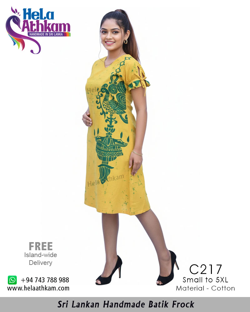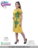 * කහ පැහැයෙන් යුත් පසුබිමක කොල පැහැයෙන් නිර්මාණය කරන ලද ඉපැරණි ශ්රී ලංකාවේ භාවිතා වූ සාම්ප්රදායික එල්ලෙන පහනක අලංකාර සිතුවමකින් සමන්විත වෙනස්ම අයුරක අපටම ආවේණික වූ බතික් ගවුමක්.