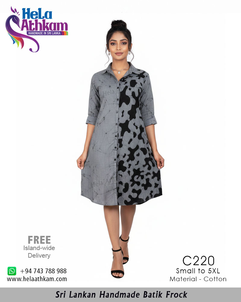 * කලු සහ අළු පැහැයෙන් යුතු ඇදුම් ප්රියකරන කාන්තා ඔබ වෙනුවෙන්ම නවතාවයකින් හැඩගැන්වුනු අලන්කාර රටාවක් සහිත බතික් ගවුමක්.