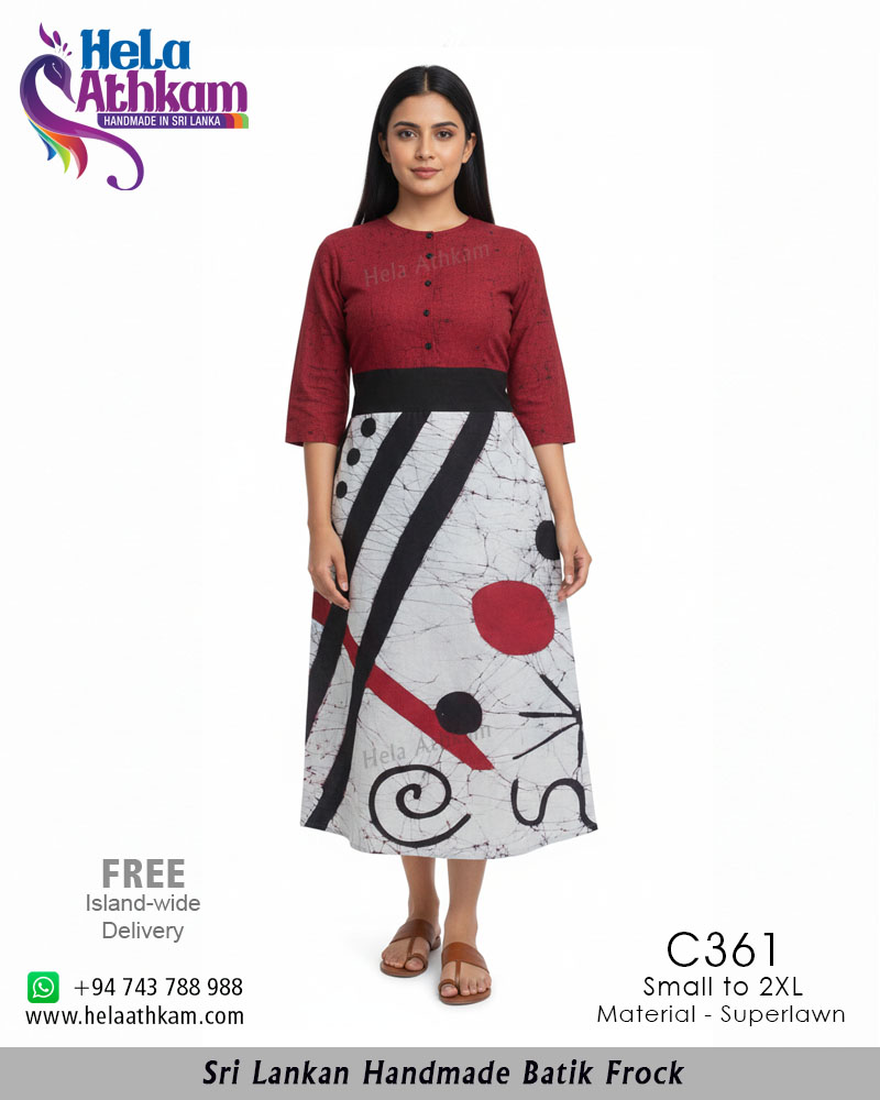 * රතු කලු සහ සුදු වර්ණයන්ගේ සම්මිශ්රණයකින් විචිත්රවත් ලෙස නිර්මාණය කරන ලද නවතාවයකින් යුතු දිගු බතික් ගවුමක්.