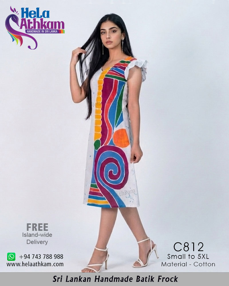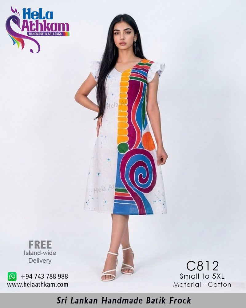 සුදු පැහැති පසුබිමක විචිත්ර වර්ණ රටා ඇසුරෙන් ශ්රී ලාංකීය සාම්ප්රදායික බතික් ක්රමශිල්ප භාවිතයෙන් “හෙළ අත්කම්“ විසින්ම 100% අතින් නිපැයූ උසස් තත්වයේ නියම දේශීය බතික් ගවුමක්.