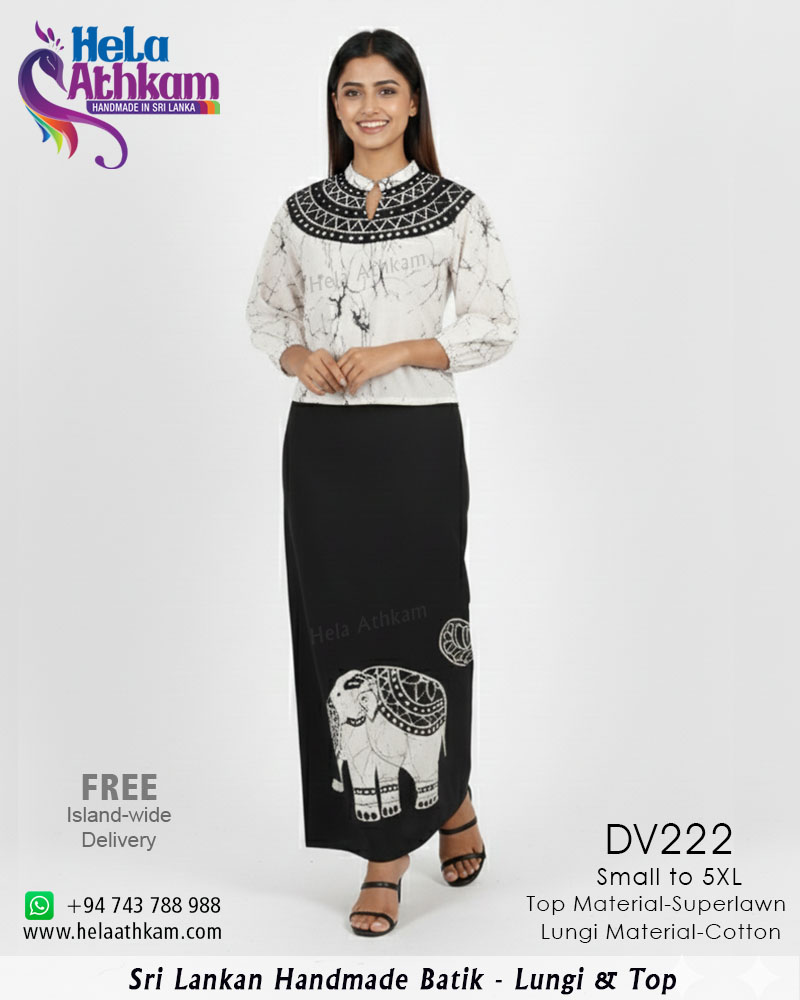 ශ්රී ලාංකීය සාම්ප්රදායික බතික් ක්රමශිල්ප භාවිතයෙන් 100% අතින් නිපැයූ උසස් තත්වයේ නියම දේශීය බතික් සම්පූර්ණ කාන්තා ලුන්ගි ඇඳුමක්.