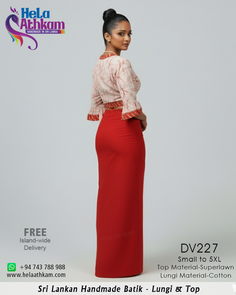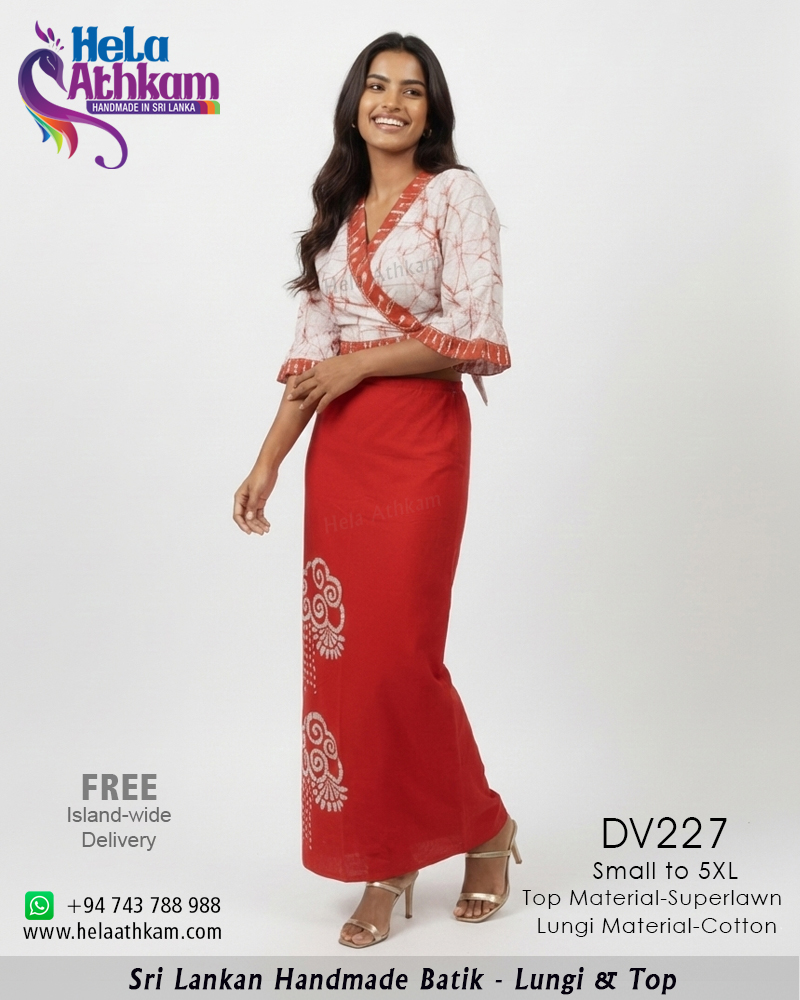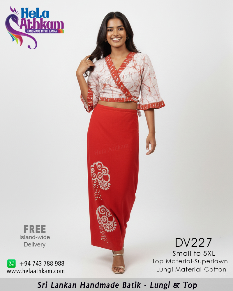 ශ්රී ලාංකීය සාම්ප්රදායික බතික් ක්රමශිල්ප භාවිතයෙන් 100% අතින් නිපැයූ උසස් තත්වයේ රක්ත වර්ණ දේශීය බතික් ලුන්ගි ඇඳුමක්.