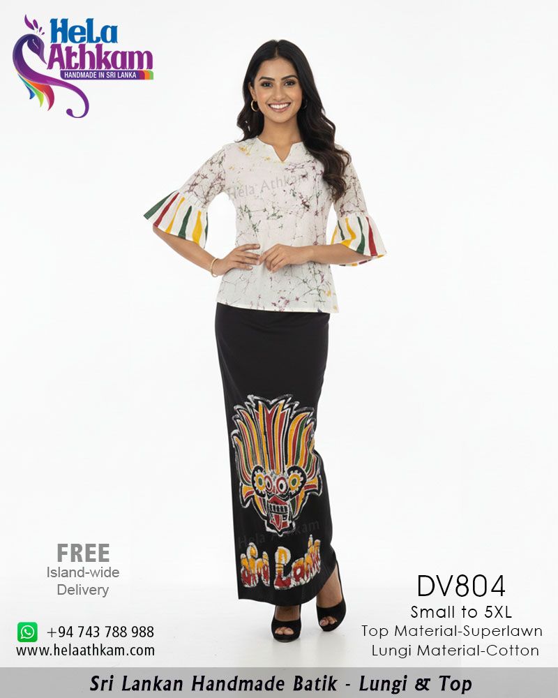 ශ්රී ලාංකේය අනන්යතාවය ලොවට විදහාපාන වර්ණවත් ගිනි රාක්ෂ (යක්ෂ) රුවක් ඇසුරින් සාම්ප්රදායික බතික් ක්රමශිල්ප භාවිතයෙන් “හෙළ අත්කම්“ විසින්ම 100% අතින් නිපැයූ උසස් තත්වයේ නියම දේශීය බතික් ලුන්ගි ඇඳුමක්.