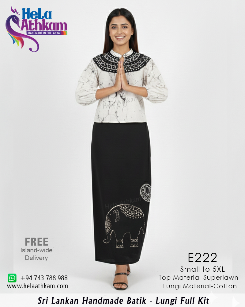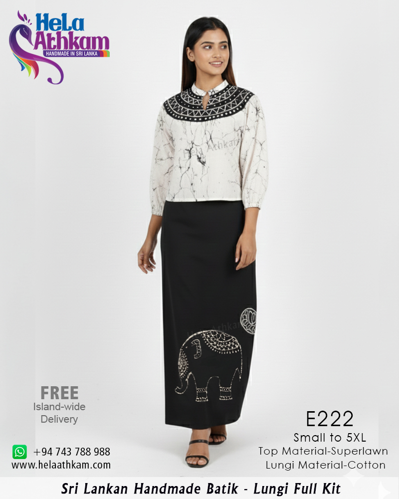 ශ්රී ලාංකීය සාම්ප්රදායික බතික් ක්රමශිල්ප භාවිතයෙන් 100% අතින් නිපැයූ උසස් තත්වයේ නියම දේශීය බතික් සම්පූර්ණ කාන්තා ලුන්ගි ඇඳුමක්.