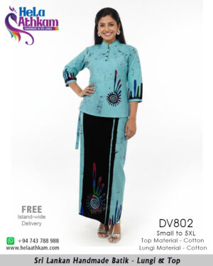 මධ්‍ය ලක්ෂයක සිට වෛවර්ණයෙන් පිටතට විහිදී යන පරිදි ලා නිල් පැහැති පසුබිමක ශ්‍රී ලාංකීය සාම්ප්‍රදායික බතික් ක්‍රමශිල්ප භාවිතයෙන් “හෙළ අත්කම්“ විසින්ම 100% අතින් නිපැයූ උසස් තත්වයේ නියම දේශීය බතික් ලුන්ගි සරමක්.