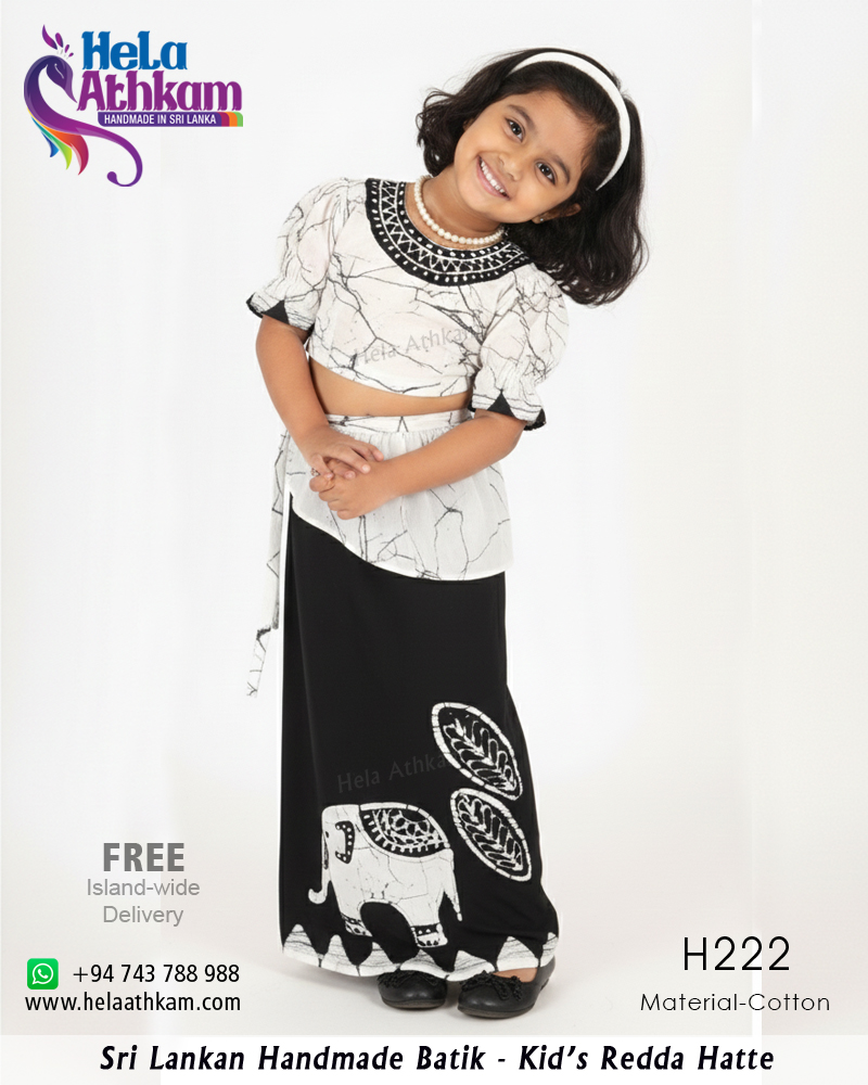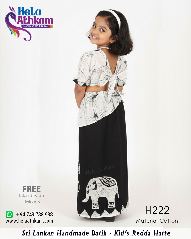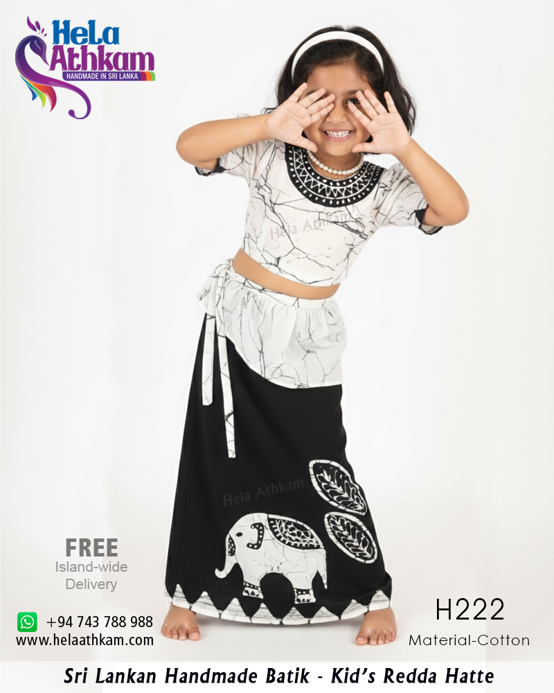 Sri Lankan handmade Batik Redda Hatte (Half Saree) for kids with elephant in the jungle design manufactured by “Hela Athkam” using traditional Sri Lankan Batik techniques.
