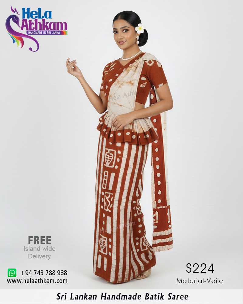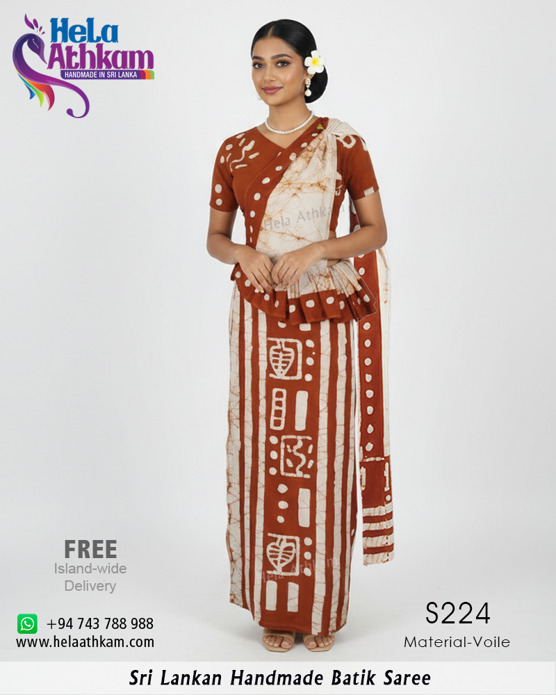 ශ්රී ලාංකීය සාම්ප්රදායික බතික් ක්රමශිල්ප භාවිතයෙන් 100% අතින් නිපැයූ උසස් තත්වයේ නියම දේශීය බතික් සාරියක්/ඔසරියක්.