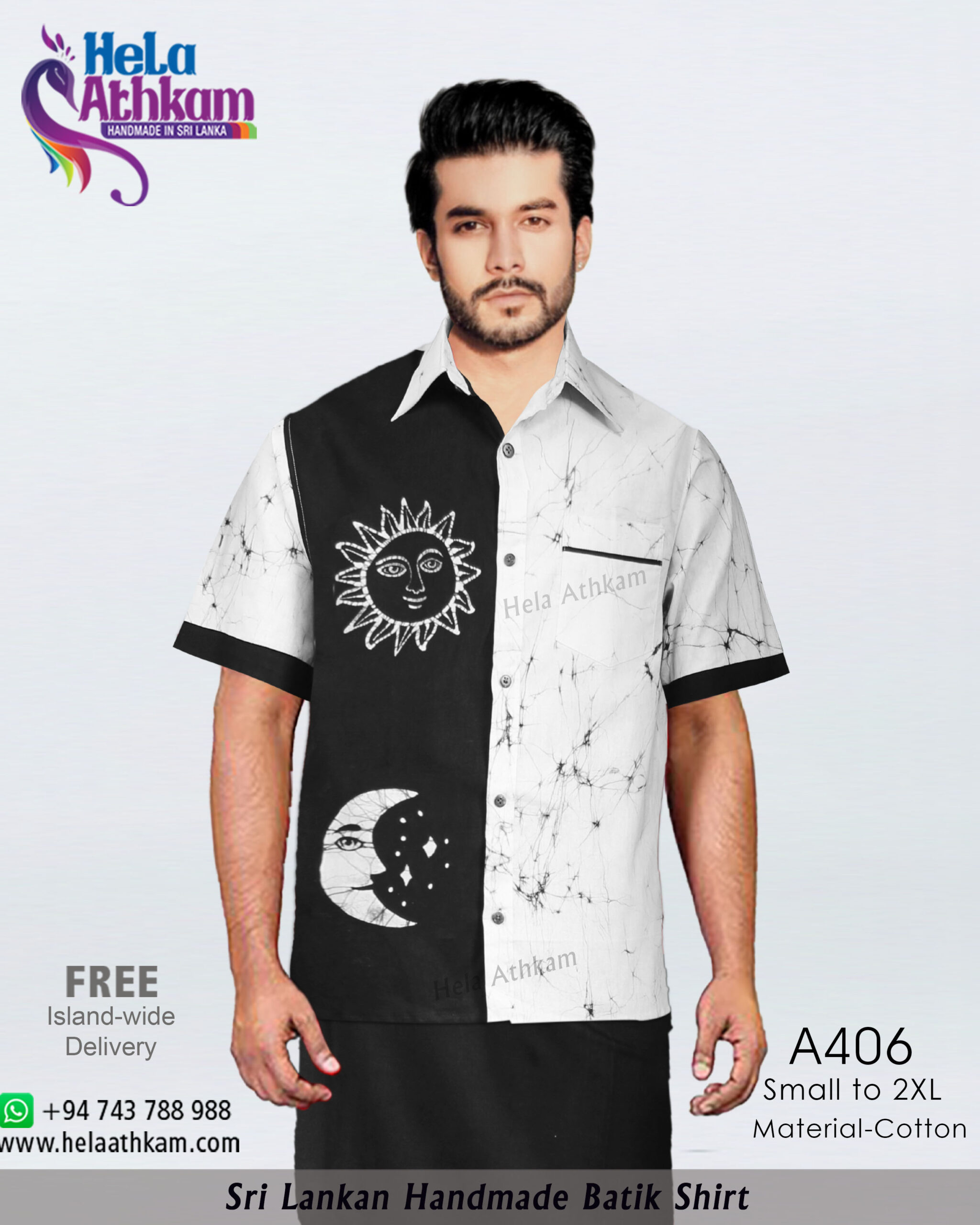 * A Sri Lankan batik shirt with a trendy pattern in black color and white colour.