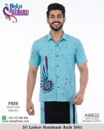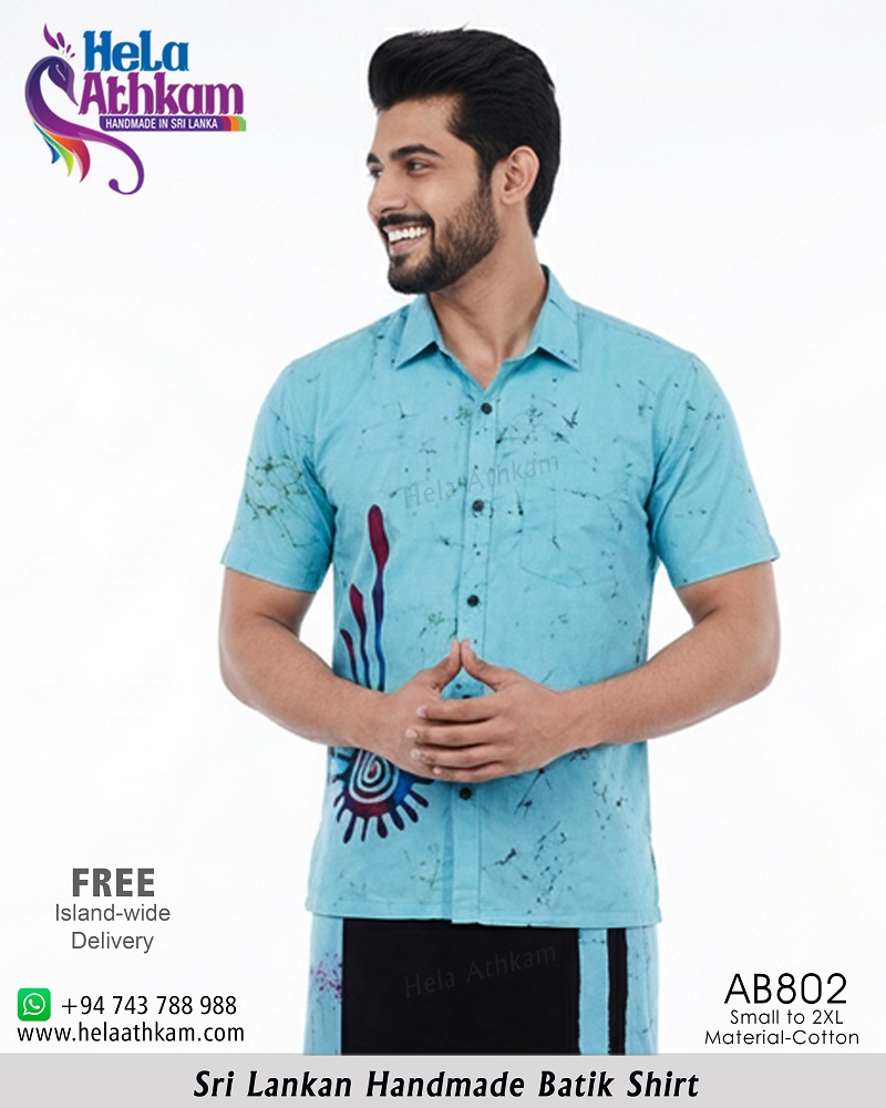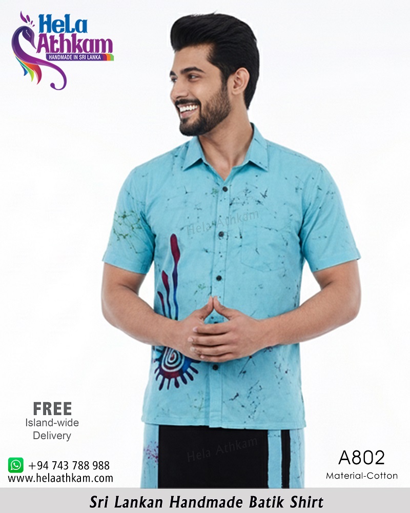 මධ්ය ලක්ෂයක සිට වෛවර්ණයෙන් පිටතට විහිදී යන පරිදි ලා නිල් පැහැති පසුබිමක ශ්රී ලාංකික සාම්ප්රදායික බතික් ක්රමශිල්ප භාවිතයෙන් “හෙළ අත්කම්“ විසින්ම 100% අතින් නිපැයූ උසස් තත්වයේ නියම දේශීය බතික් කමිසයක්.