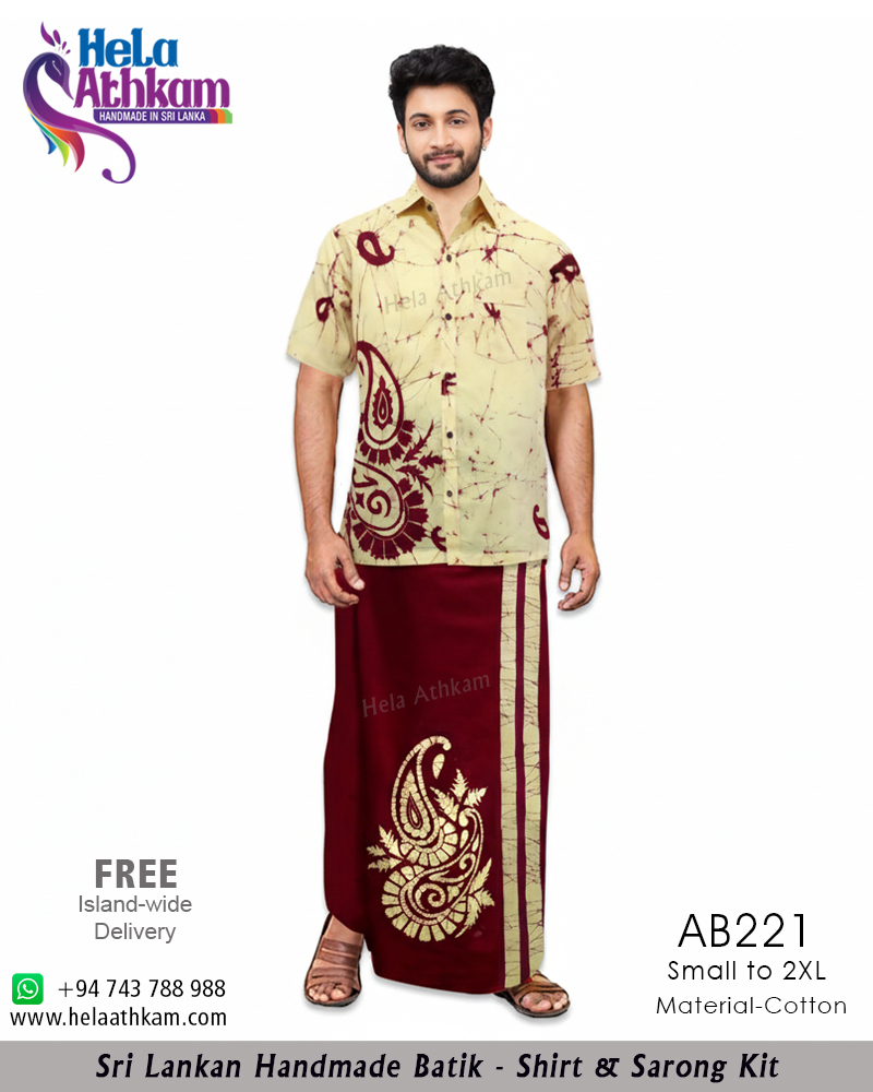Sri Lankan handmade Batik Shirt and Sarong Kit designed in maroon and ivory colors with an extracted “Liyawel’ design from traditional Sri Lankan carving arts manufactured by “Hela Athkam” using traditional Sri Lankan Batik techniques.