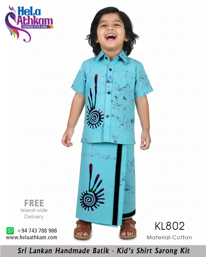 මධ්‍ය ලක්ෂයක සිට වෛවර්ණයෙන් පිටතට විහිදී යන පරිදි ලා නිල් පැහැති පසුබිමක ශ්‍රී ලාංකික සාම්ප්‍රදායික බතික් ක්‍රමශිල්ප භාවිතයෙන් “හෙළ අත්කම්“ විසින්ම 100% අතින් නිපැයූ උසස් තත්වයේ නියම දේශීය ළමා බතික් කමිසයක් සහ සරමක්.