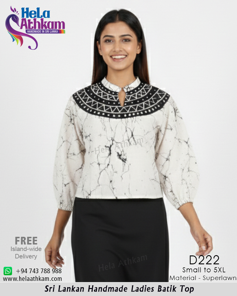 Black & White color handmade Ladies Batik Top manufactured by “Hela Athkam” using traditional Sri Lankan Batik techniques.