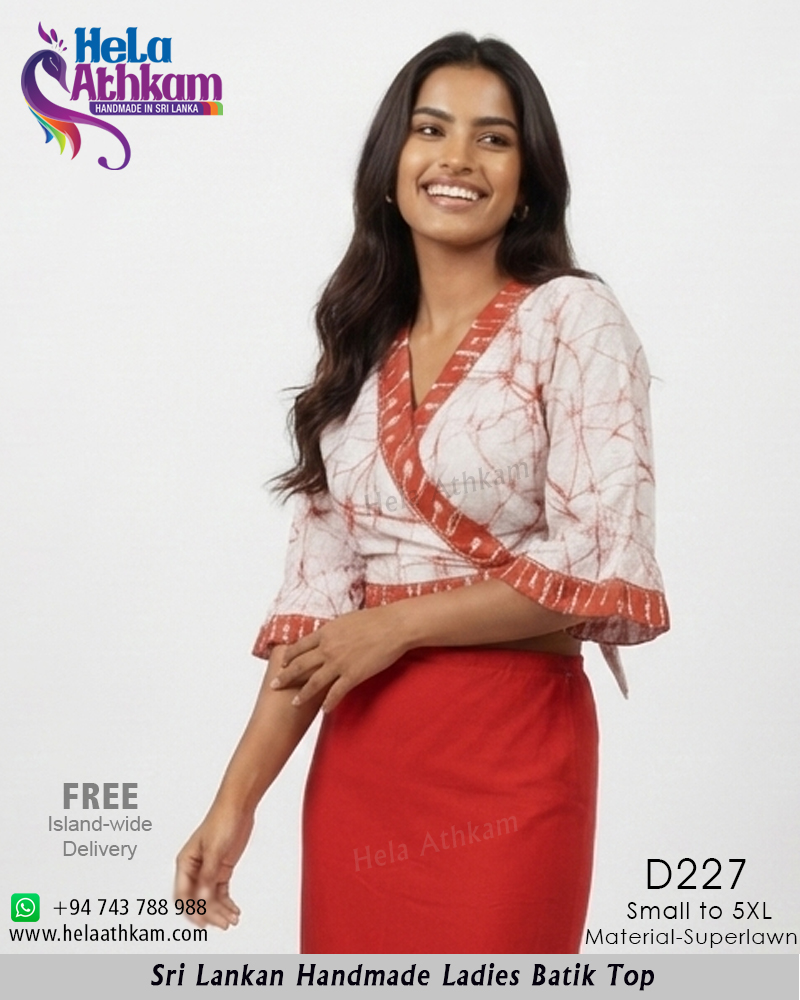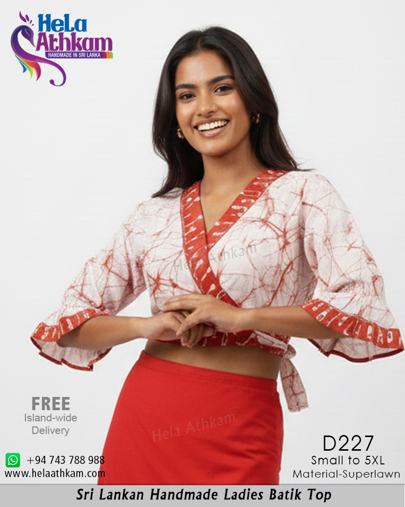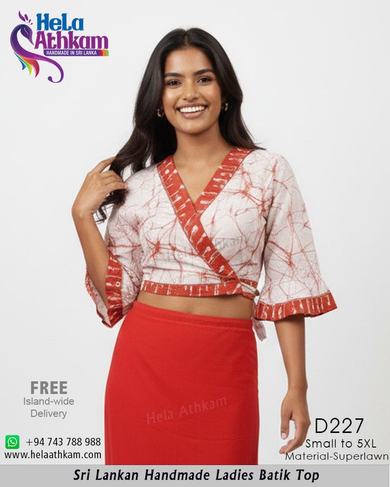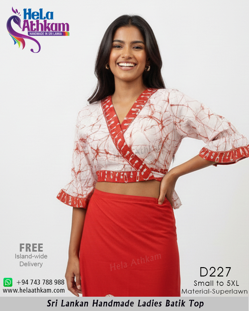 Red color handmade Ladies Batik Top manufactured by “Hela Athkam” using traditional Sri Lankan Batik techniques.