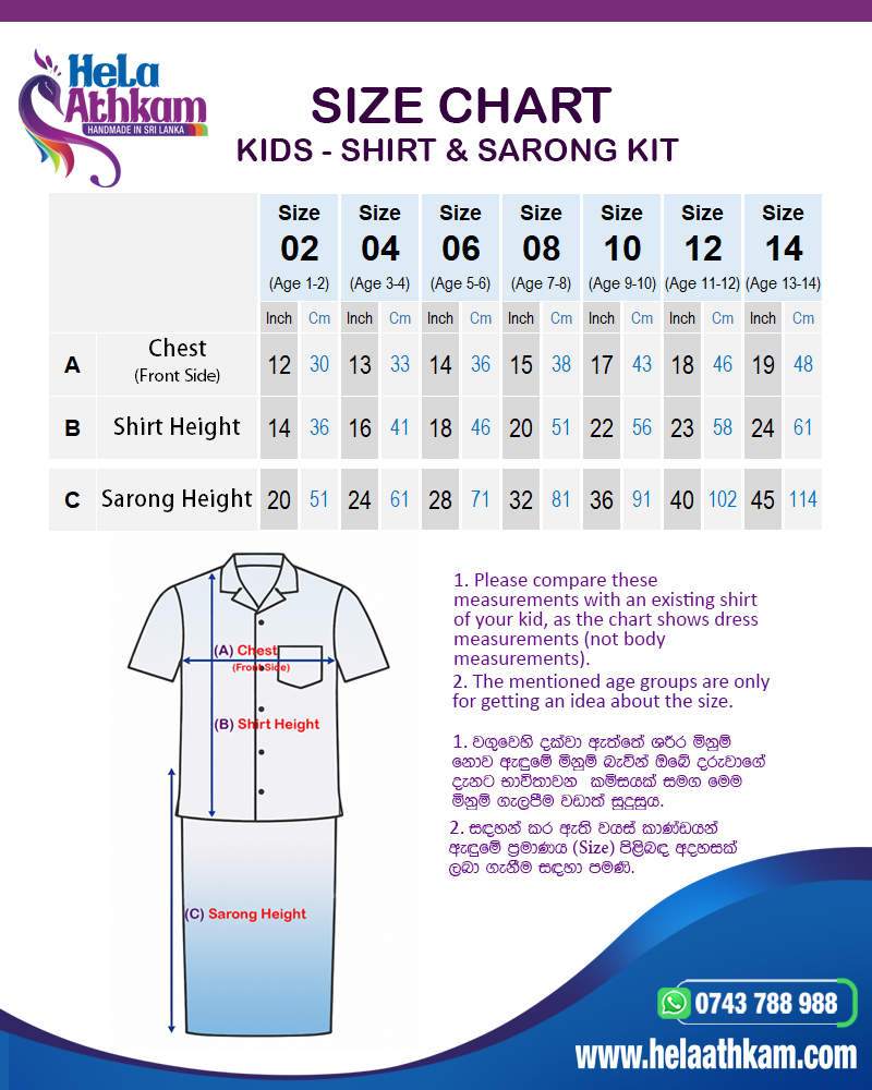 * සුරතල් පුංචි පුතුන් වෙනුවෙන් දේශීය අනන්‍යතාවය සනිටුහන් කරමින් ලාංකීය අලි පැටවුන් සහිත රටා ඇසුරෙන් නිර්මාණය කරන ලද ළමා බතික් කමිසයක් සහ කමිසයක්. * පවුලේ සැමටම එකම රටාවකින් යුතු ඇඳුම් ප්‍රිය කරන ඔබ වෙනුවෙන් මෙම ඇඳුමටම ගැලපෙන රටාවෙන් නිර්මාණය කරන ලද වැඩිහිටි කමිසය සහ සරම ( AB321 – Gent’s Shirt & Sarong Kit)  කාන්තා ඇඳුම් ( E321/E322 – Lungi Kits)  කුඩා දියණියන් (H321 – Redda Hatte) වෙනුවෙන් නිර්මාණය කරන ලද ඇඳුම්ද අප වෙතින් ලබාගත හැක. * සපයා ඇති මිමි වගුව ( Size Chart) අනුව ප්‍රමාණ (size) 7ක් අතරින්  පුතුට ගැලපෙන කමිසය සහ සරම තෝරාගත හැක. * මුදල් ගෙවීමේ ක්‍රම කිහිපයක් / දිවයිනපුරා බෙදාහැරීම නොමිලේ. * Kid’s batik shirt & sarong designed with a pattern of Sri Lankan Elephants, symbolizing the Sri Lankan identity for cute little boys. * For those who love same design dresses for the whole family, we have designed gent’s kits (AB321 – Gent’s Shirt & Sarong Kit))  ladies kit (E321/E322 – Lungi Kits) baby girl kits (H321 – Redda Hatte) in the same design. * You may select the correct size for your kid among the 07 different sizes from the provided size chart. * Multiple Payment Options / Island-wide Free Delivery.