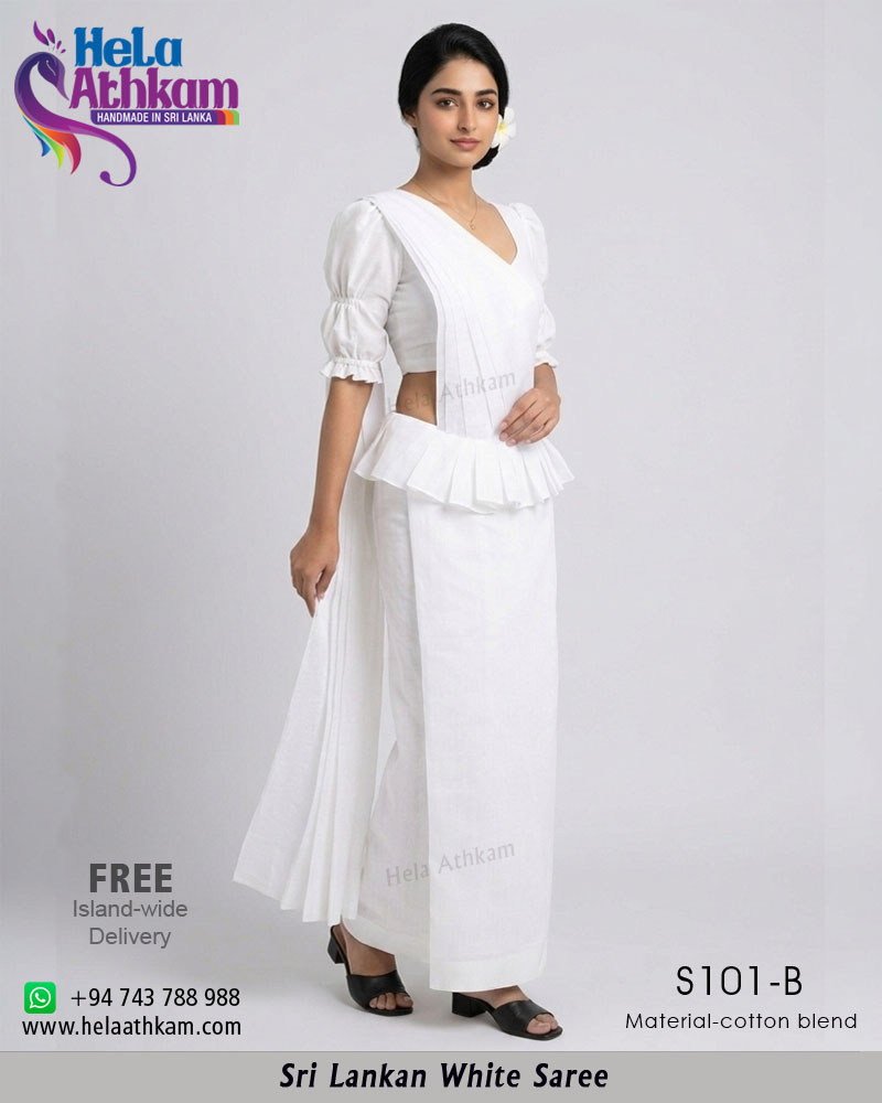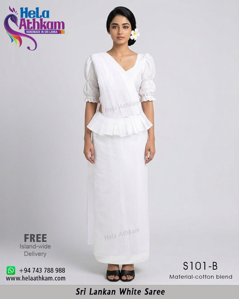 Made from an Indian cotton blend fabric with a small white border design, which is more suitable for wearing an Osariya.(We have other types of white saree suitable for “Sariya”)