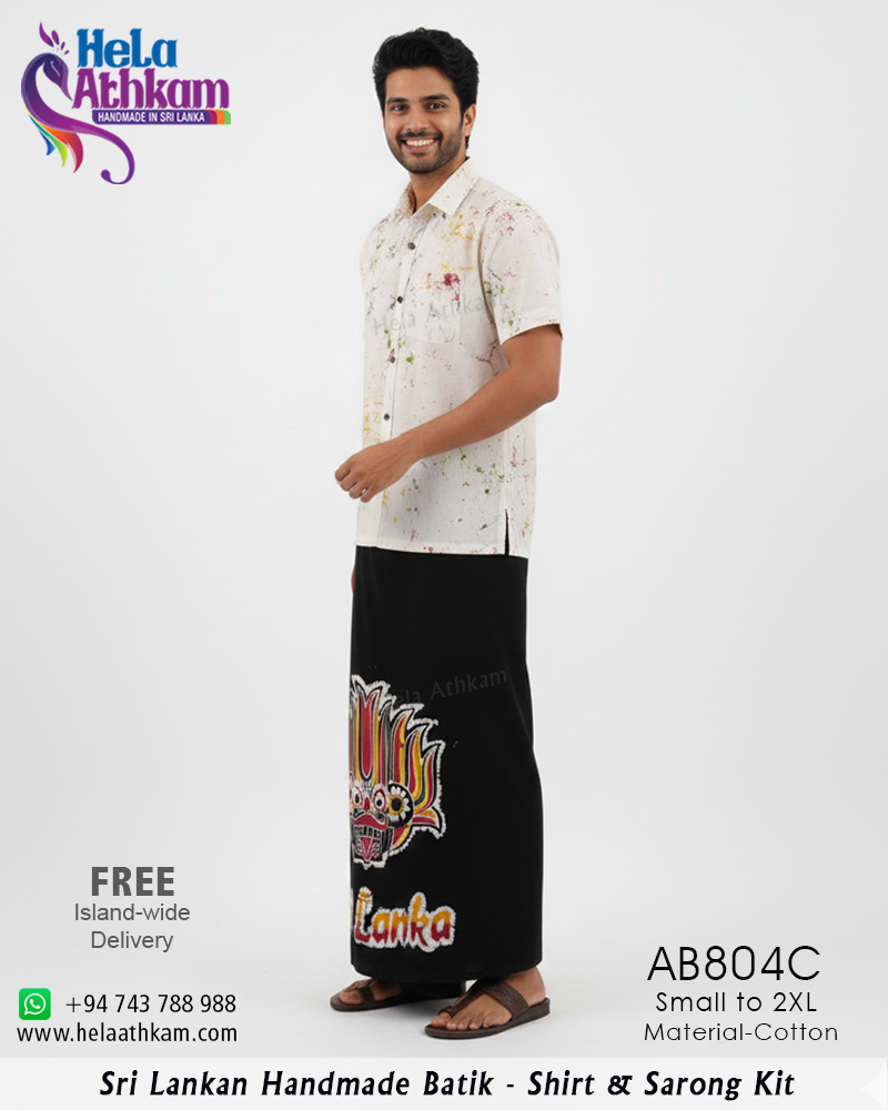ශ්රී ලාංකීය සාම්ප්රදායික බතික් ක්රමශිල්ප භාවිතයෙන් 100% අතින් නිපැයූ උසස් තත්වයේ නියම දේශීය බතික් කමිසයක් සහ සරමක්.